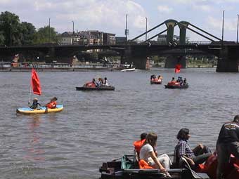 Spontan entscheiden sich Schaulustige an der Aktion teilzunehmen. Aufnahme von Kunstbegeisterten auf ein Boot...Alles ist Kunst!